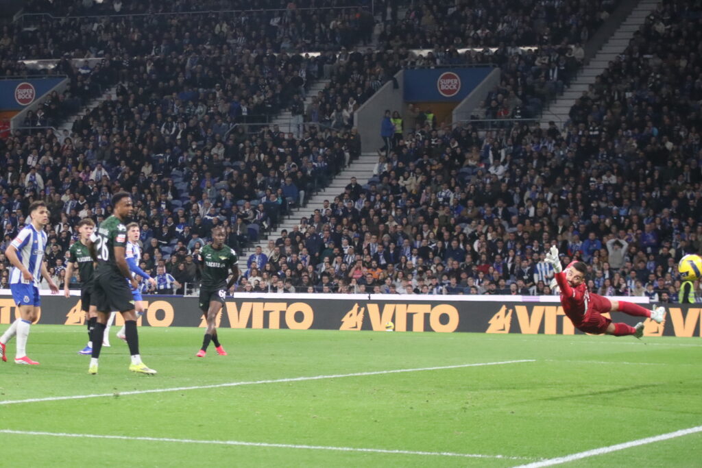 Já perto do apito final, Rodrigo Mora tentou imitar o gesto do colega no lado oposto, mas o guardião do Moreirense, numa noite de trabalho árduo, evitou o quarto golo com uma defesa atenta.