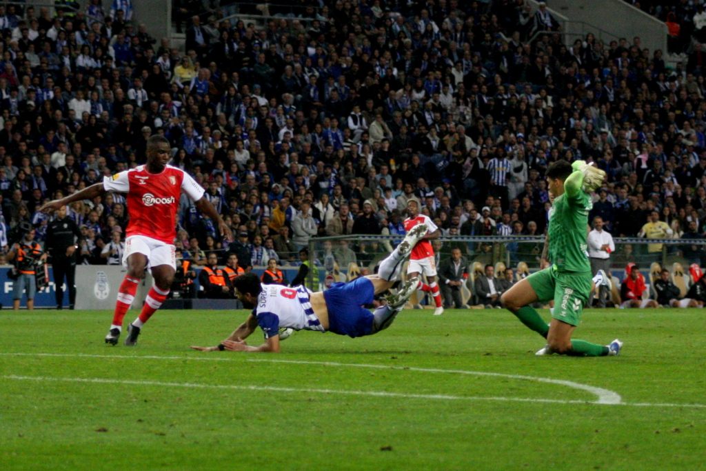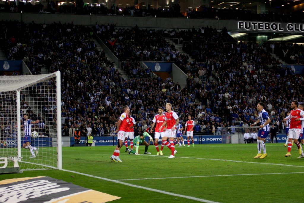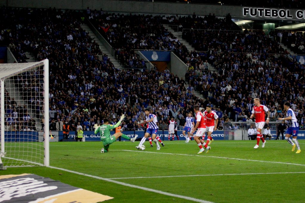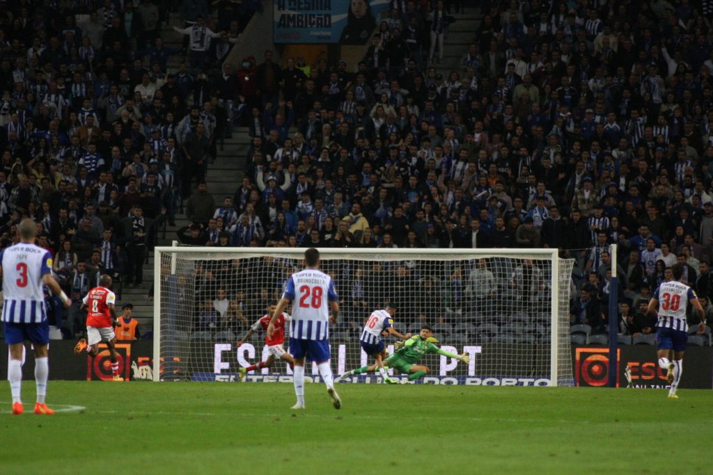 O SC de Braga praticamente só conseguiu responder aos 43 minutos quando Diogo Costa saiu a Iuri Medeiros, falhou a interceção, deixando o Bracarense isolado e sem ninguém na baliza. Rematou de pronto, mas errou por centímetros o alvo, depois da bola passar em frente à linha de golo.